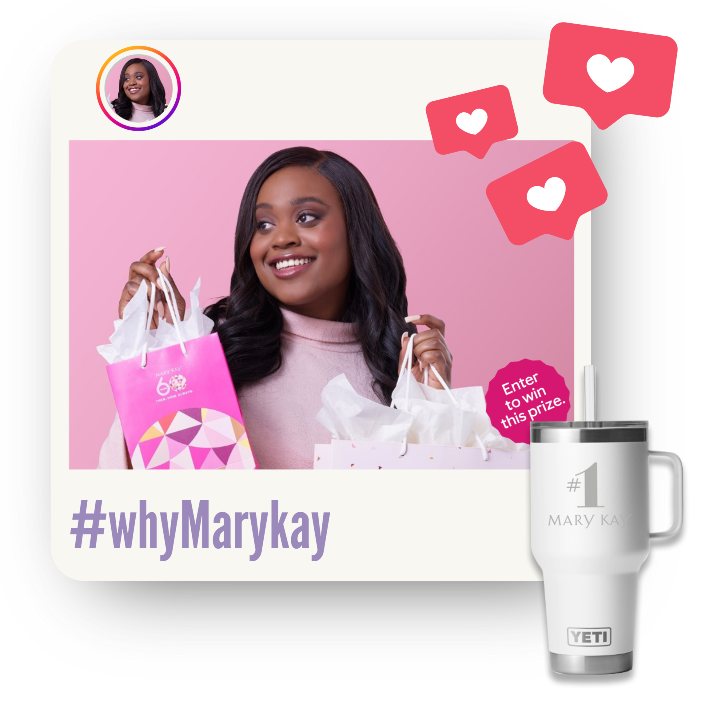 Be entered to win a #1 branded Yeti tumbler by using the hashtag #WhyMaryKay in the captions of your posts. 60 winners will be selected in total.