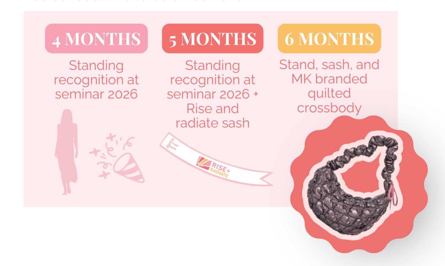 Grow and progress your sales and earn exclusive rewards and recognition when you take part in the Rise + Radiate Beauty Consultant Selling Challenge! Now is the time to bring your success to new heights!An Independent Beauty Consultant can achieve this challenge when she orders $600 or more in wholesale Section 1* products each month for four, five or six months during the January – June 2026 time frame. The orders to support the monthly $600 or more amount do not need to be consecutive to be an achiever.